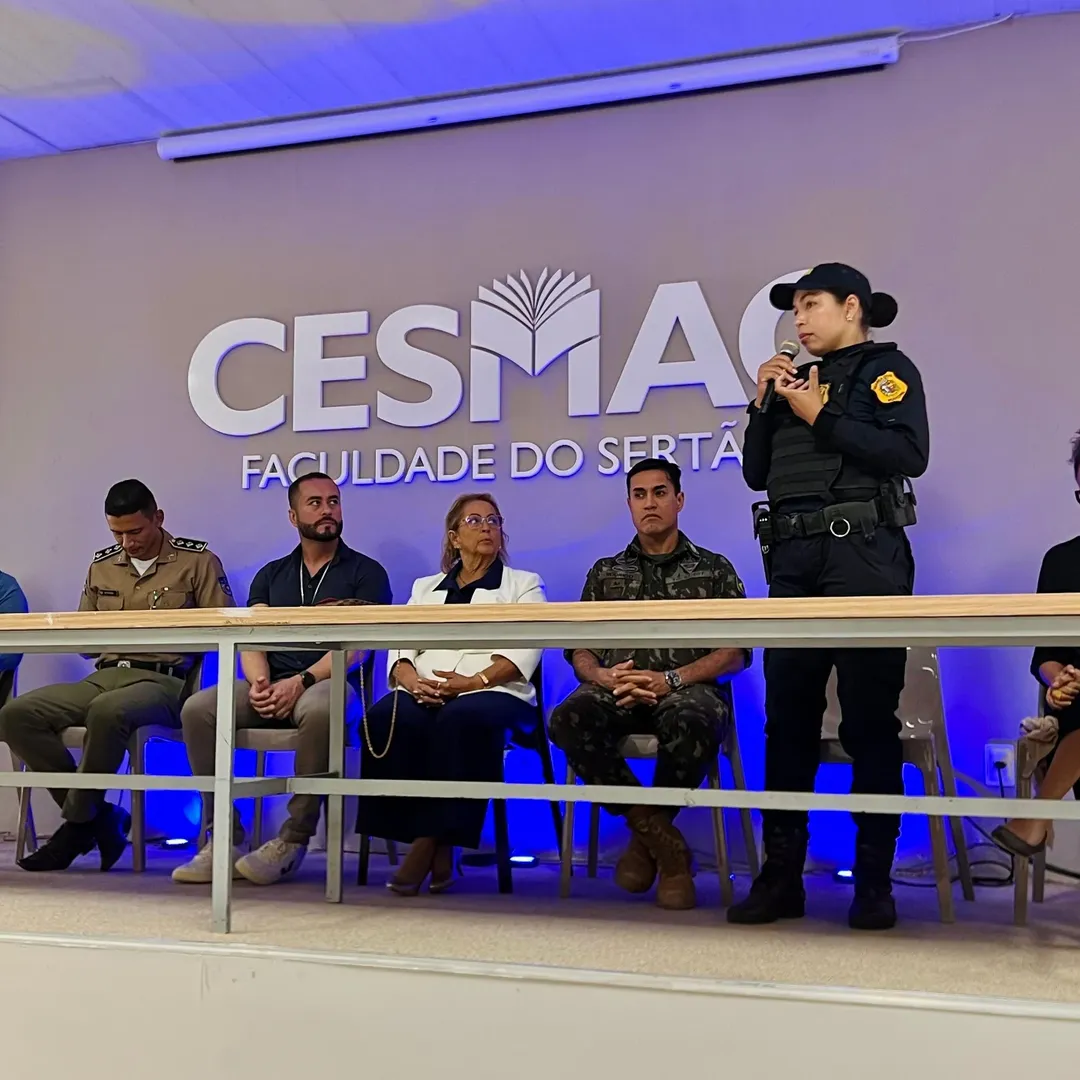 A mesa de autoridades foi composta pela secretária da Mulher e Direitos Humanos, Rosângela Damião; pelo chefe de operações da 5ª Delegacia Regional de Polícia de Palmeira dos Índios, Diogo Martins; pelo representante do 10º Batalhão de Polícia Militar, Capitão; pela subcomandante da Patrulha Maria da Penha, Sil Alves; pelo comandante do Tiro de Guerra 07-007, Subtenente Rodrigo Costa; pela presidente da Comissão da Mulher Especial da OAB/AL, Rosana Monteiro Damião; e pela professora da Universidade Federal de Alagoas (Ufal), Marli Araújo.