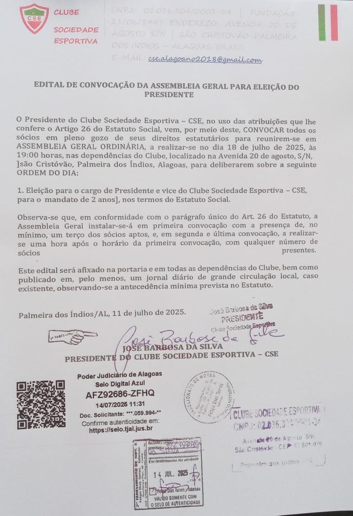 A diretoria do Clube Sociedade Esportiva (CSE) publicou edital de convocação para uma assembleia geral, marcada para a próxima sexta-feira (18), com o objetivo de eleger o novo presidente e vice-presidente do clube.
